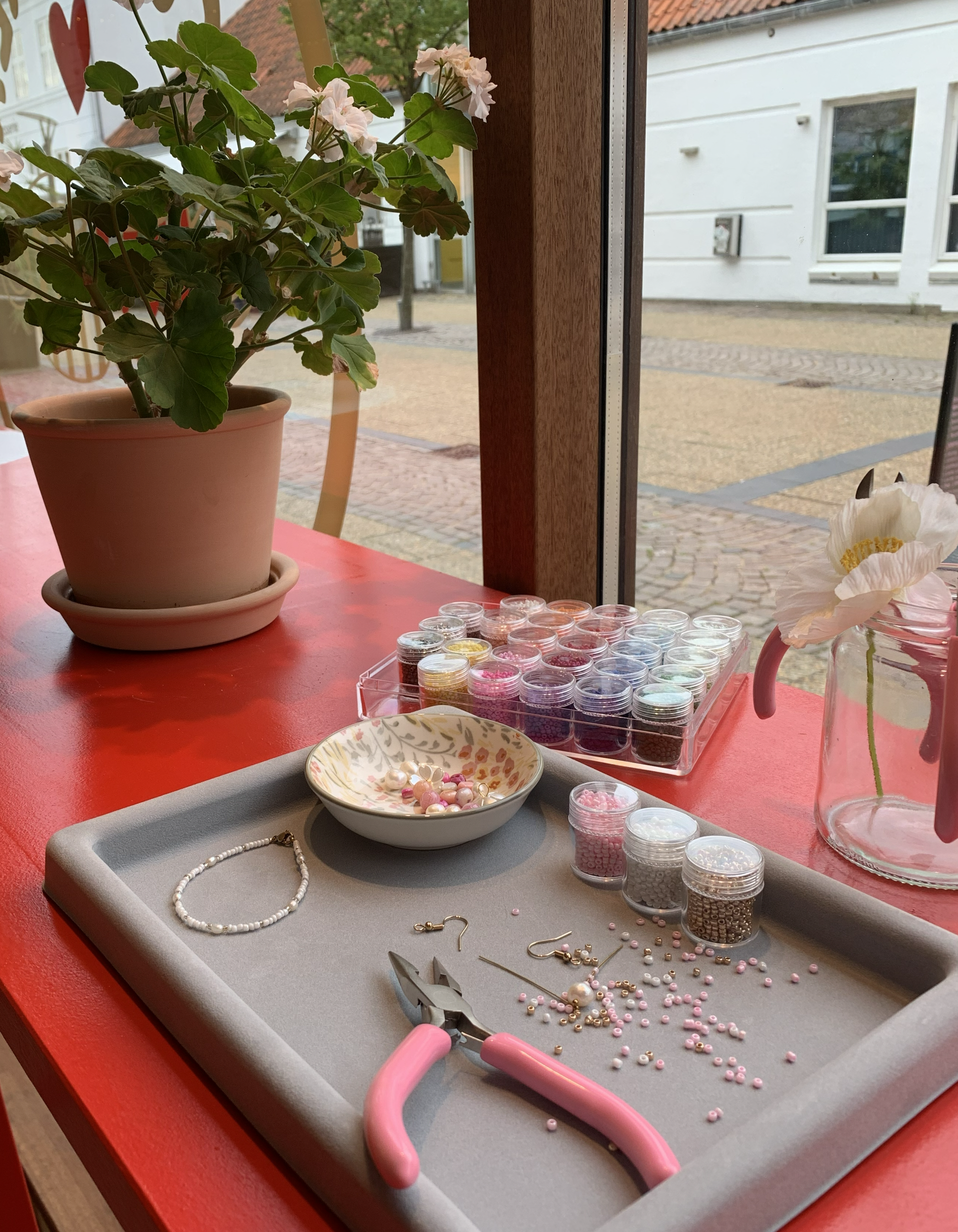 Her vælger du om det skal være armbånd (149 kr.), øreringe (149 kr.) eller halskæde (189 kr.), der skal kreeres. Vi vejleder dig gerne, samt giver tips og tricks.